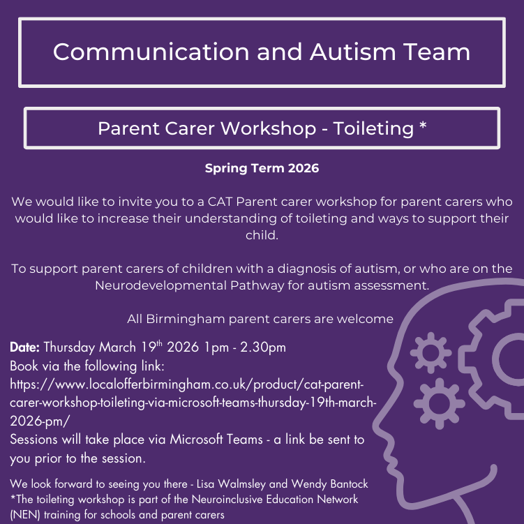 We would like to invite you to a CAT Parent carer workshop for parent carers who would like to increase their understanding of toileting and ways to support their child.